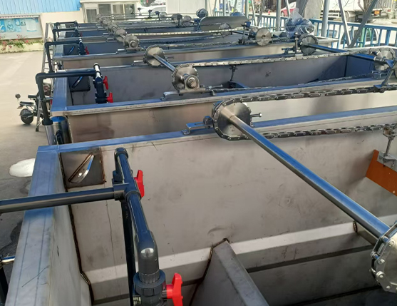 溶气泵在3.5~4bar 压力下将空气溶于清水中,含气的清水通过释放器时释放出来。由于突然减压,产生了大量的微气泡。这些微气泡与油、悬浮物等杂质粘在一起,然后通过微气泡的上升浮到水面,通过刮渣机移动到浮渣池,达到水质净化的目的。